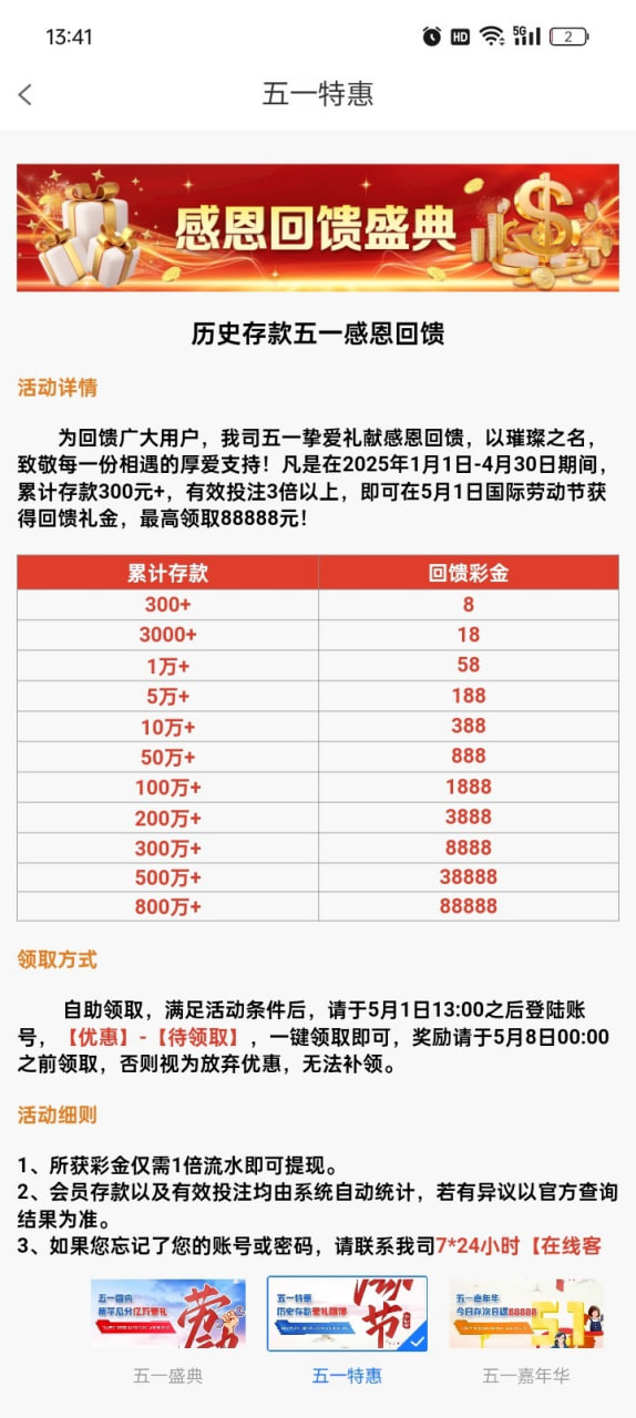 历史用户登录直接领,按照历史存款派发金额的,禁止充值。
