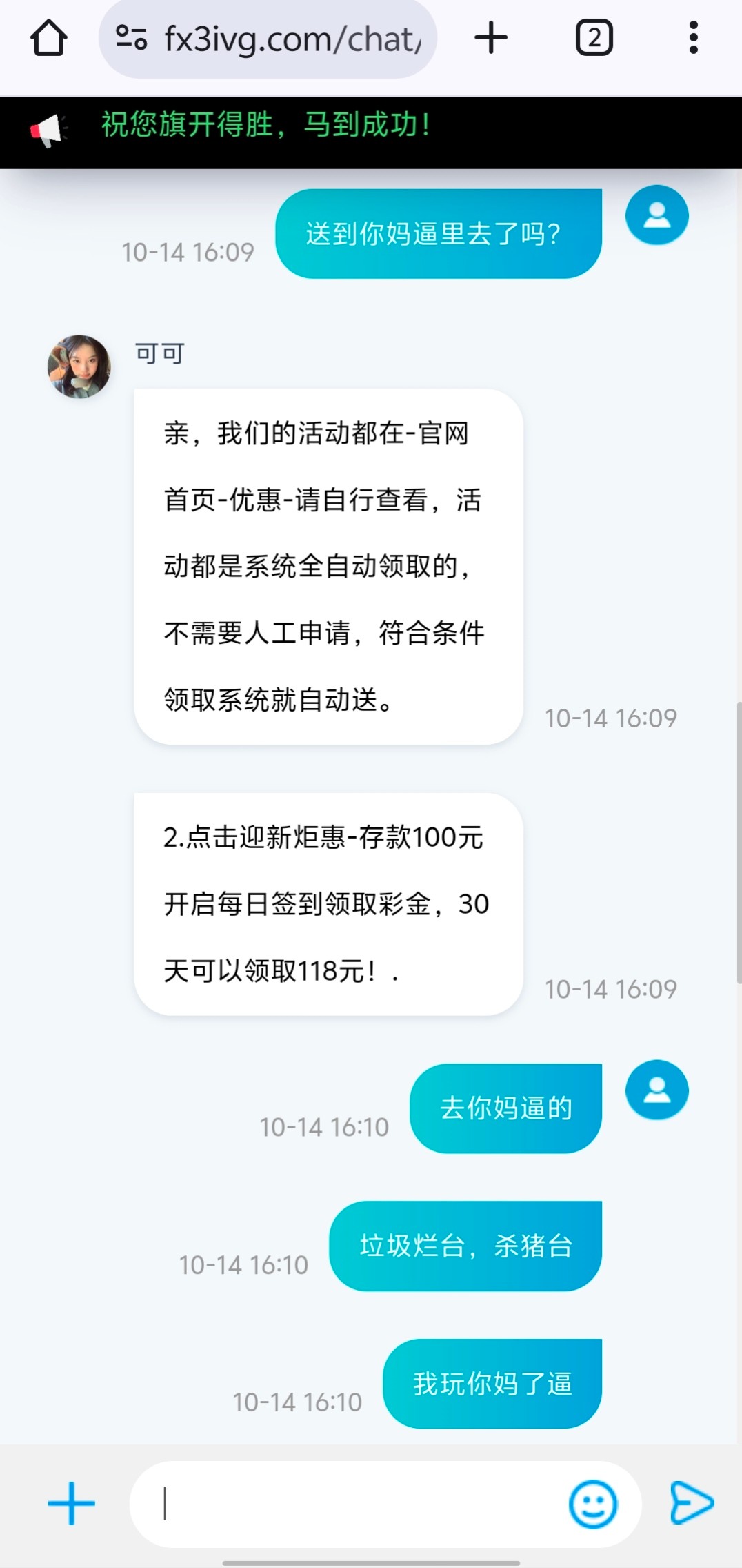 傻逼贱客服打电话过来说充100送118,结果充值了之后半天没送直接去玩pg跟假的一样100空98次直接鲨完我操你妈逼的野鸡烂平台黑台银河国际72991
