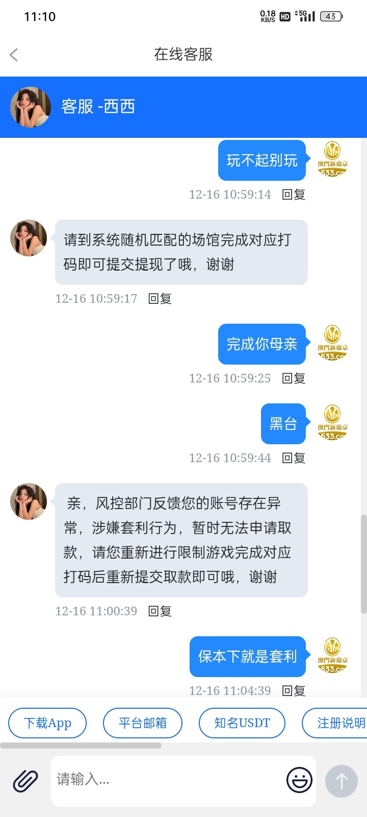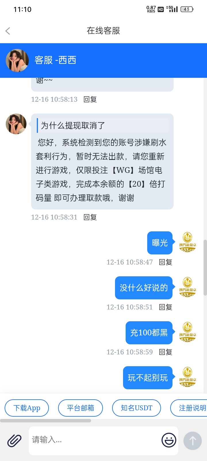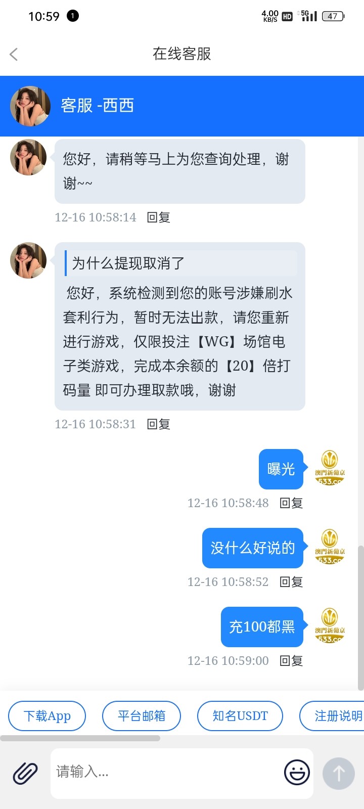 我以前就遇到过罚水15倍,冲2000打百家乐 反反复复打不上下不去,直接2000多一把了 狗客服说我倍投,我他妈的就一把定输赢说我倍投,赢了提4000喊打15倍 我就结果还提了2万多