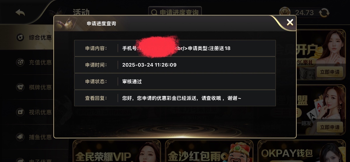 新用户注册完善资料活动里自助申请18无游戏限制,下载APP有6块红包,最低100提现,具体自测勿充值