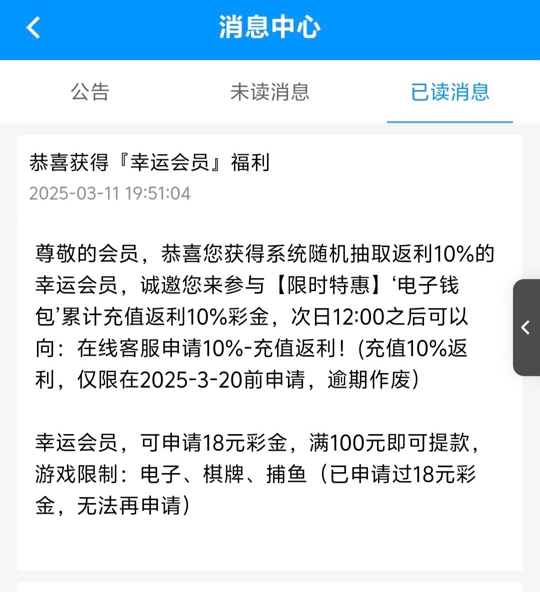 有号看看站内信有没有这条短信的 有的去申请18彩金 没有无视