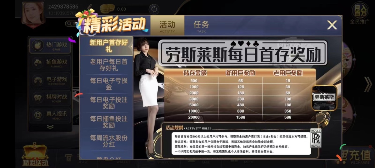 活动:新综合化平台对接透明化第三方,主营电子游戏 新老用户每日首存500+68/1000+128/只可电子,新号有水,还有每日亏损救援彩金具体看活动 注:(银行卡充提需要同实名, 不然上不了分,也处理不了,虚拟币那些不用同实名