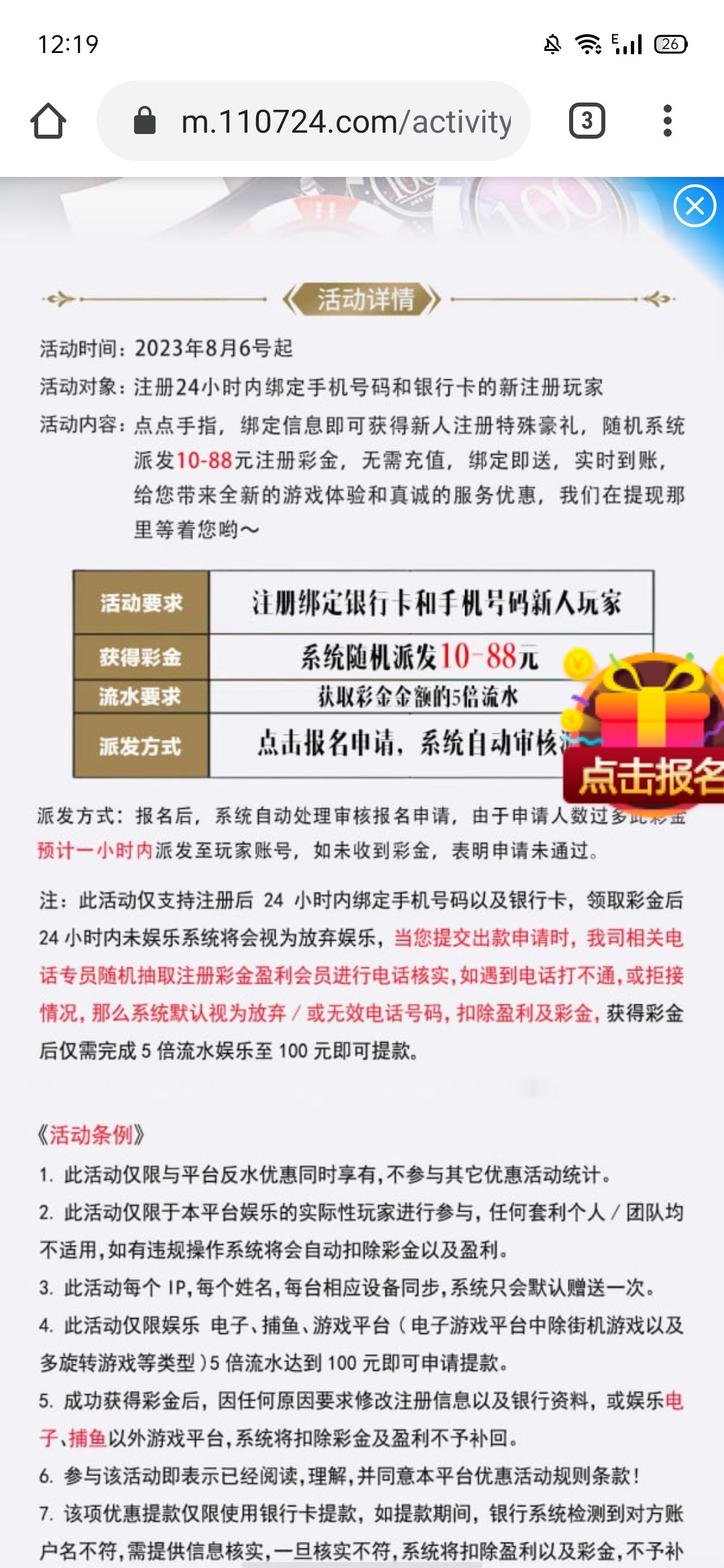 新人注册绑卡优惠里自助领取10-88彩金,老人换手机号重新撸。