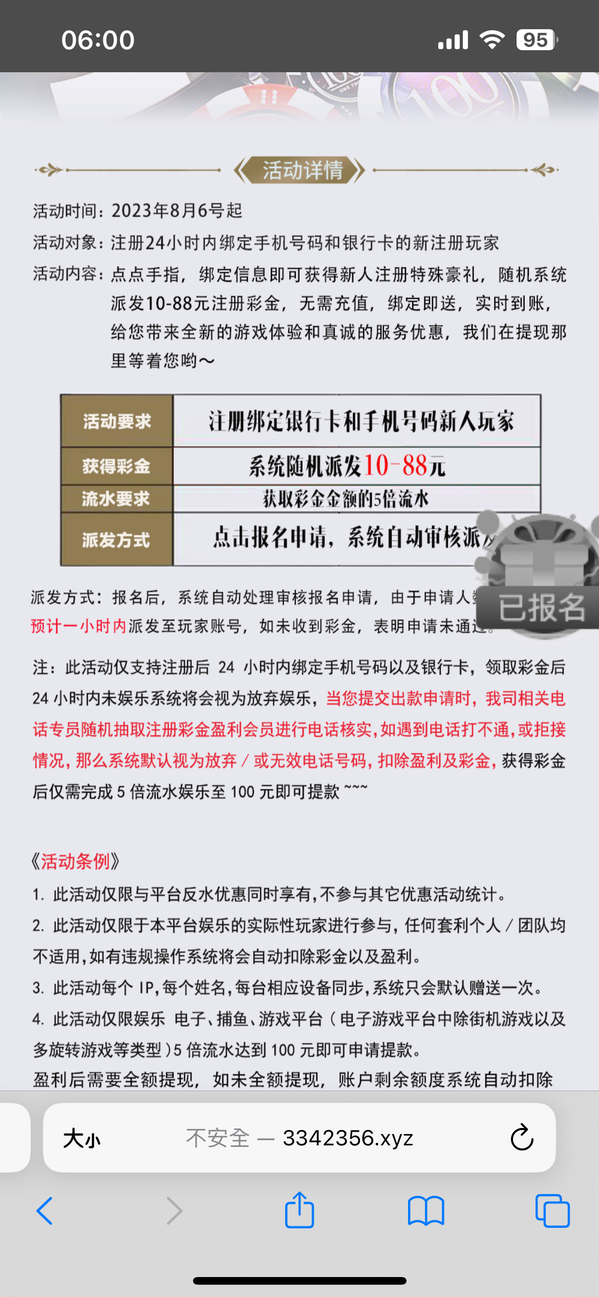 注册绑卡送10-88注册礼金 一般不会低于20 优惠里面报名申请 出款要一次性提完 不然会被扣除