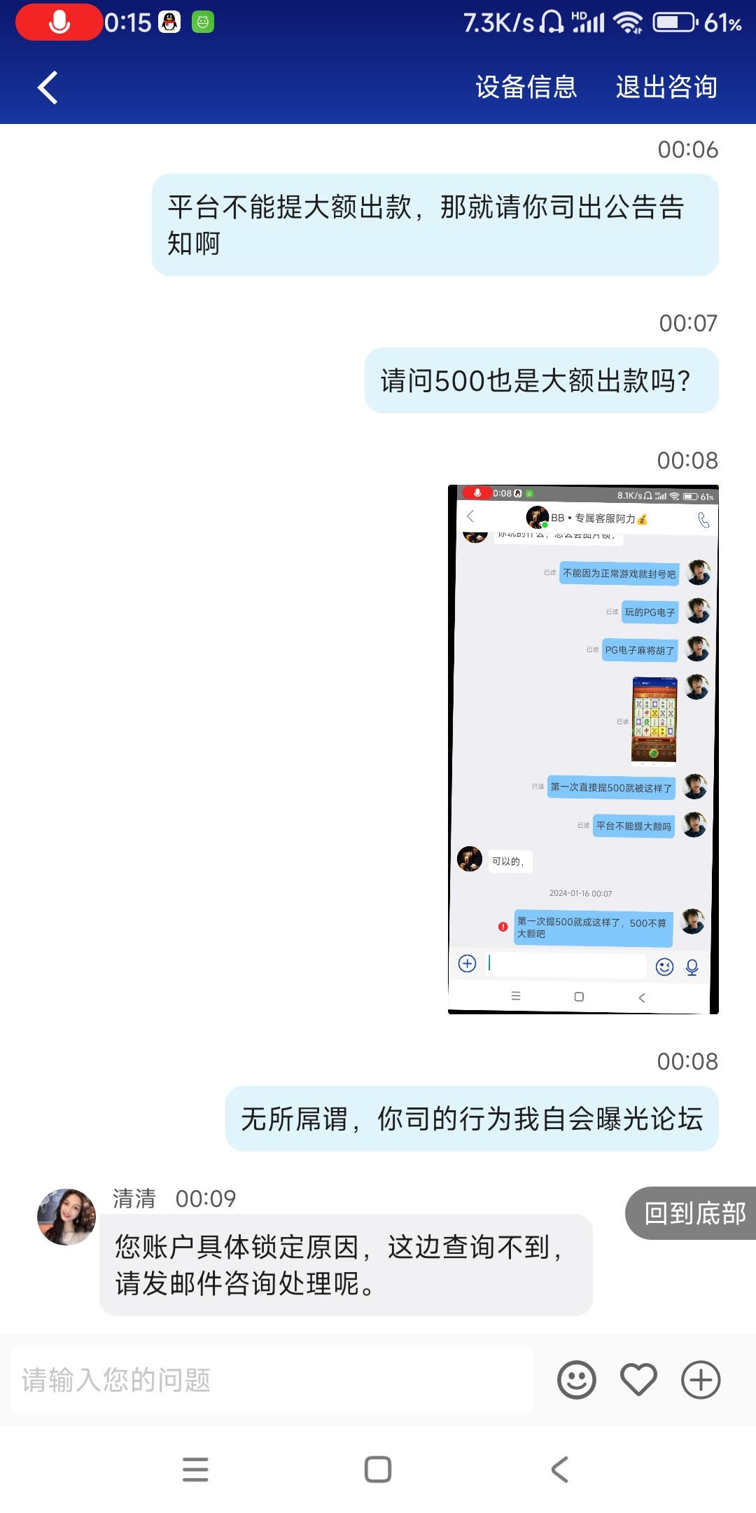 BB体育手持台避坑,VIP3老用户,之前是分批次出款到账,这次第一次直接提500直接封禁,小额能出大额必封台,开香槟