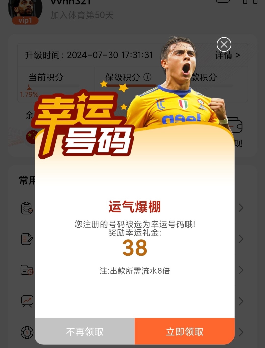 弹出来了38彩金,领不了,提示无法参与此优惠
