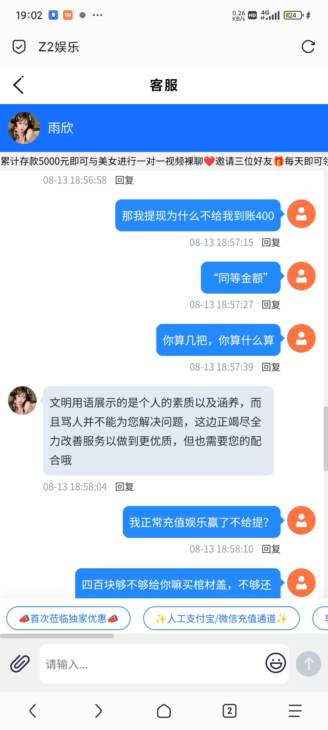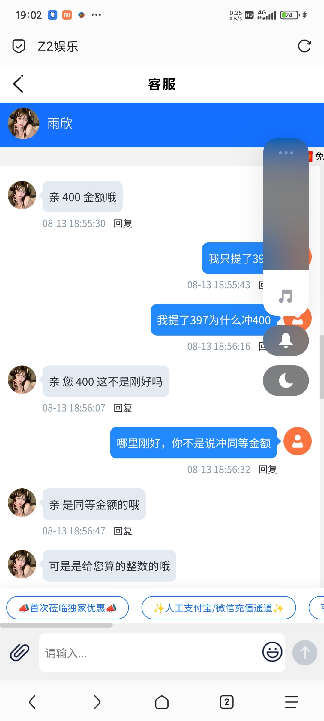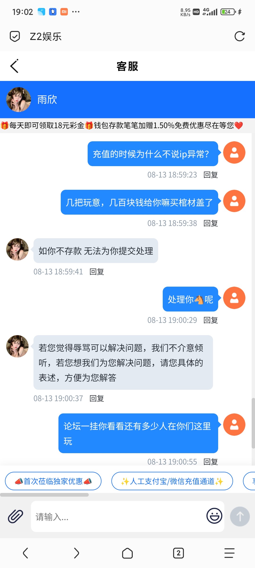z2娱乐,正常充值100提400不给出,ip异常充值同等金额,黑