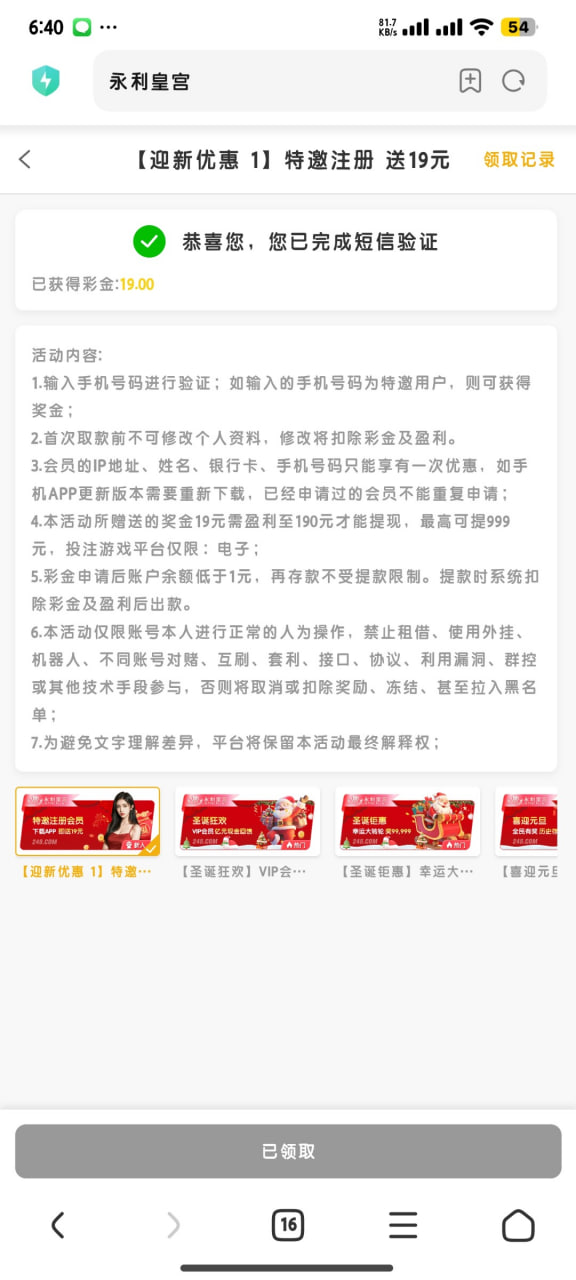 新用户自助注册账号,绑定手机号码,自己优惠里自助申请活动,在特邀名单内,都可以申请到,出款自测,禁止充值。